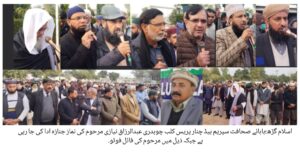 نماز جنازہ بوائز ڈگری کالج اسلام گڑھ میں ادا کردی گئی، سجادہ نشین دربار عالیہ فیضپور شریف علامہ پیر محمد حبیب الرحمن محبوبی نے نماز جنازہ پڑھائی، نماز جنازہ میں آزادکشمیر اور پاکستان سے صحافتی، سماجی، سیاسی شخصیات کی کثیر تعداد میں شرکت، ہر آنکھ اشکبار، چوھدری عبدالرزاق نیازی کی صحافتی و سماجی خدمات کو خراج تحسین،